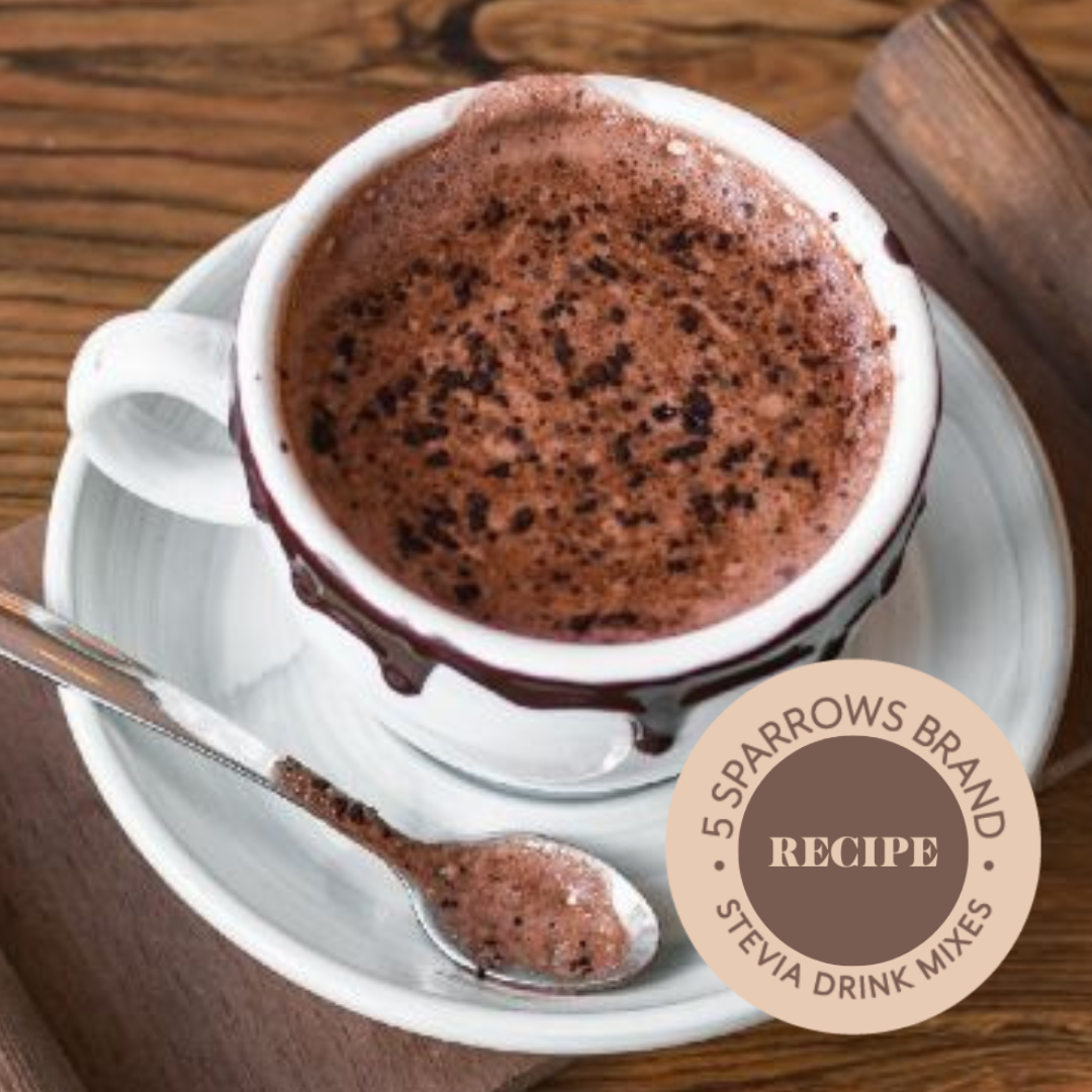 • Add 4 Tbs 5 Sparrows stevia sweetened hot chocolate drink mix.